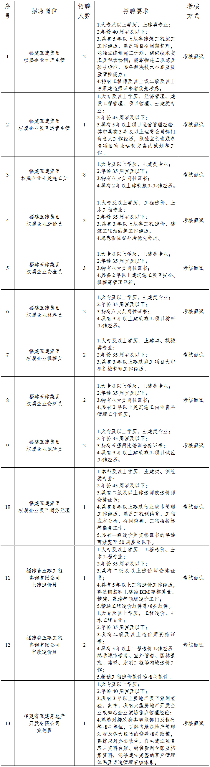 8.本公告僅適用于本次招聘,未盡事宜由福建省五建建設(shè)集團(tuán)有限公司負(fù)責(zé)解釋。